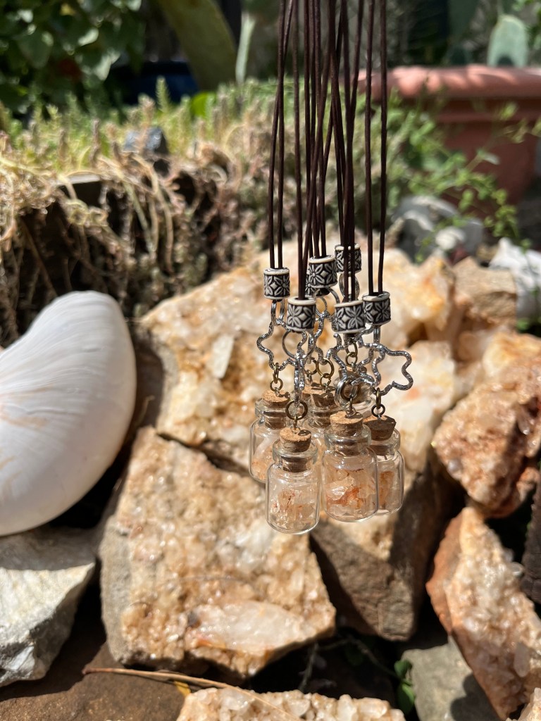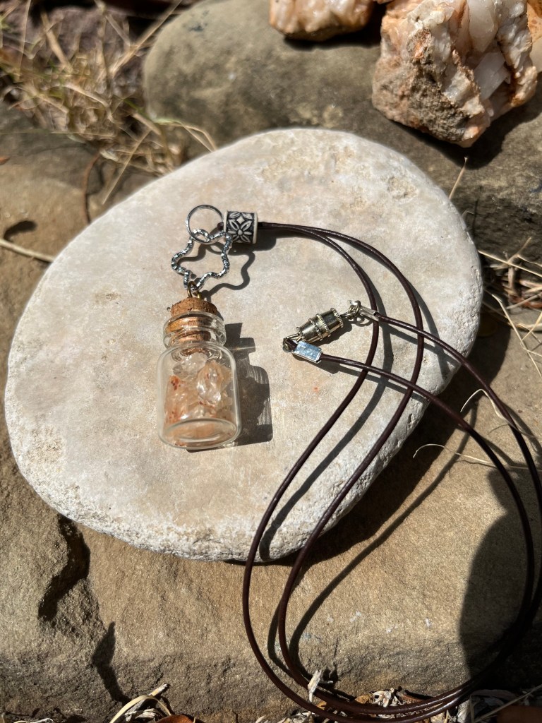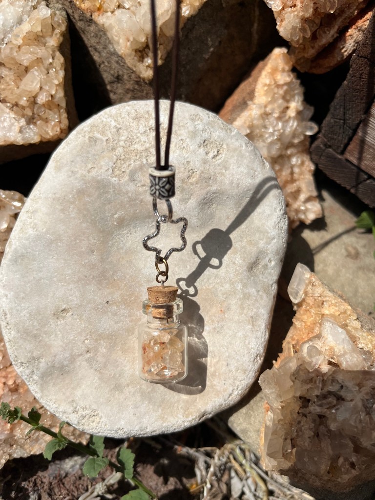 Tiny quarts crystals captured in a glass bottle, sealed with a cork and embellished with a star charm ! The pendant hangs from a faux leather cord with a secure screw-on clasp, making it both mystical and practical !