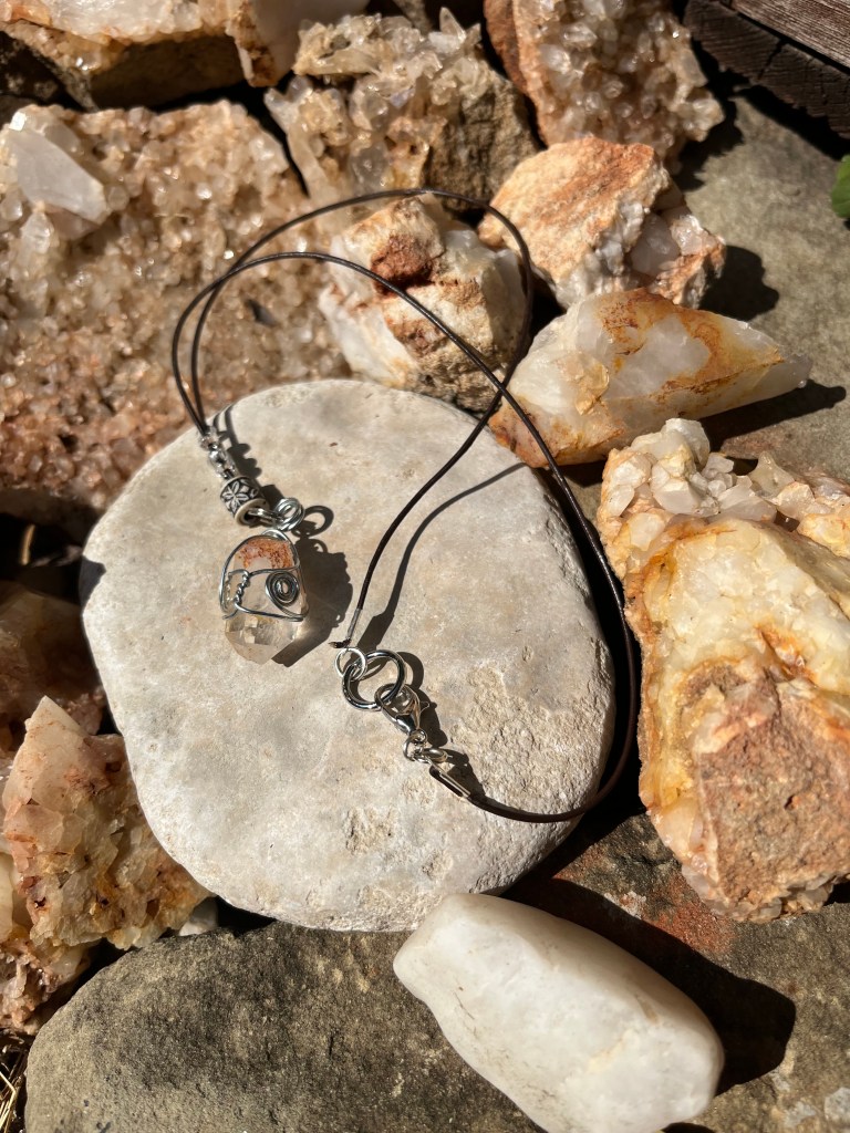 Pure Quarts, Pure Intention, like always. Hand Wrapped in silver spiral wire, resting on a soft faux leather. Held together with simple alligator clasp.