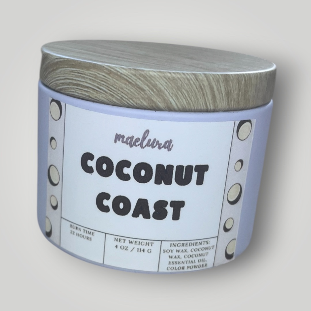 Ingredients: Coconut-Soy wax, 100% Pure Essential Oil(Coconut, Lemon, Eucalyptus) Color Powder mixed with Grape Seed Oil.