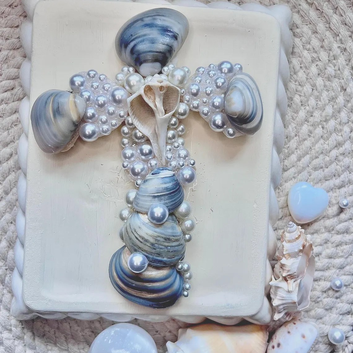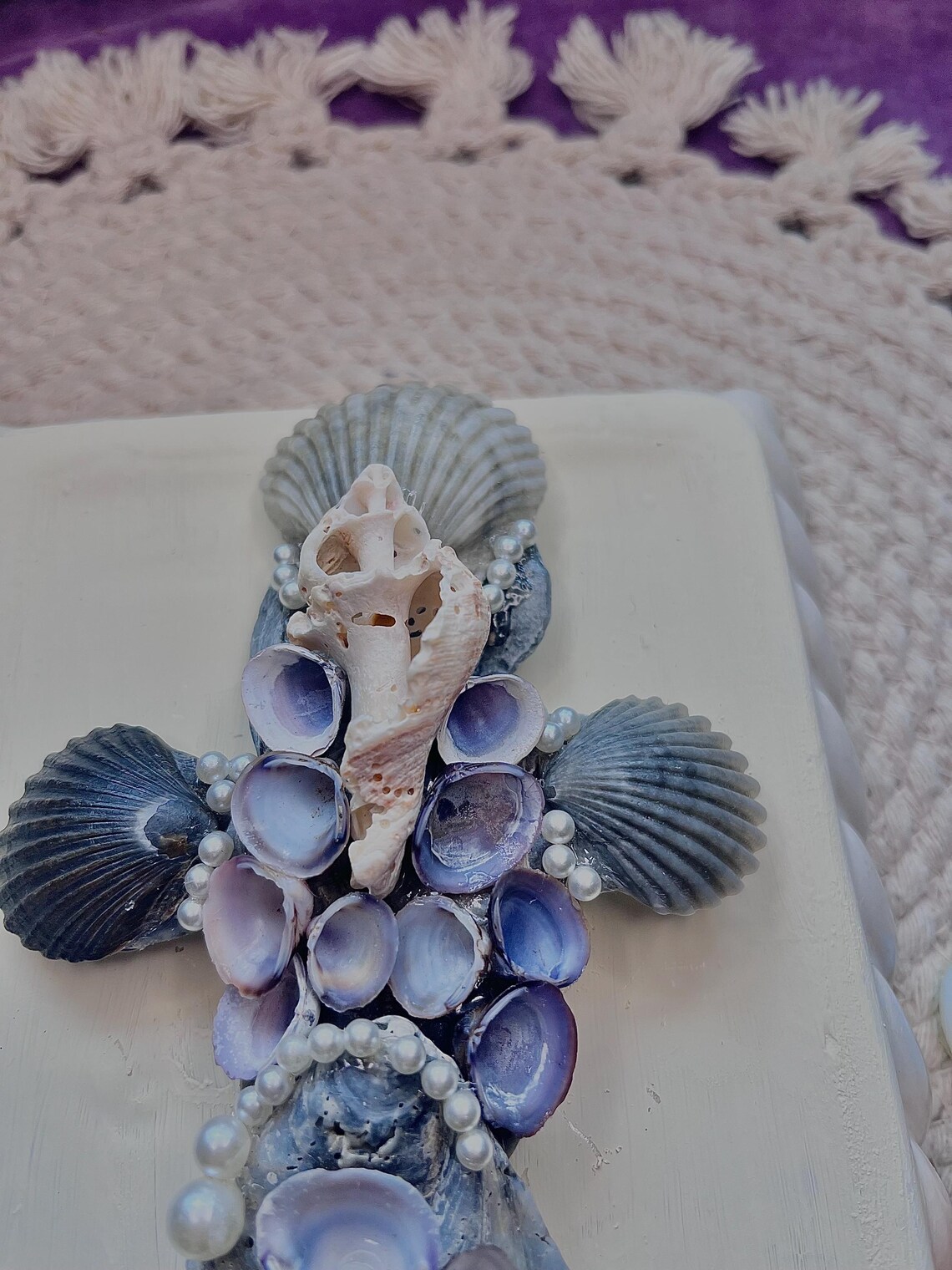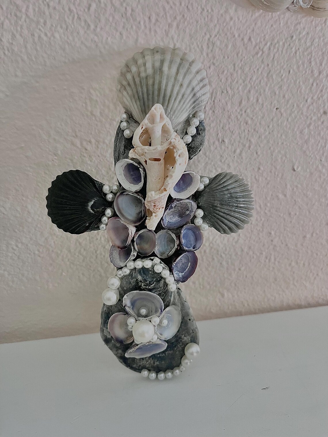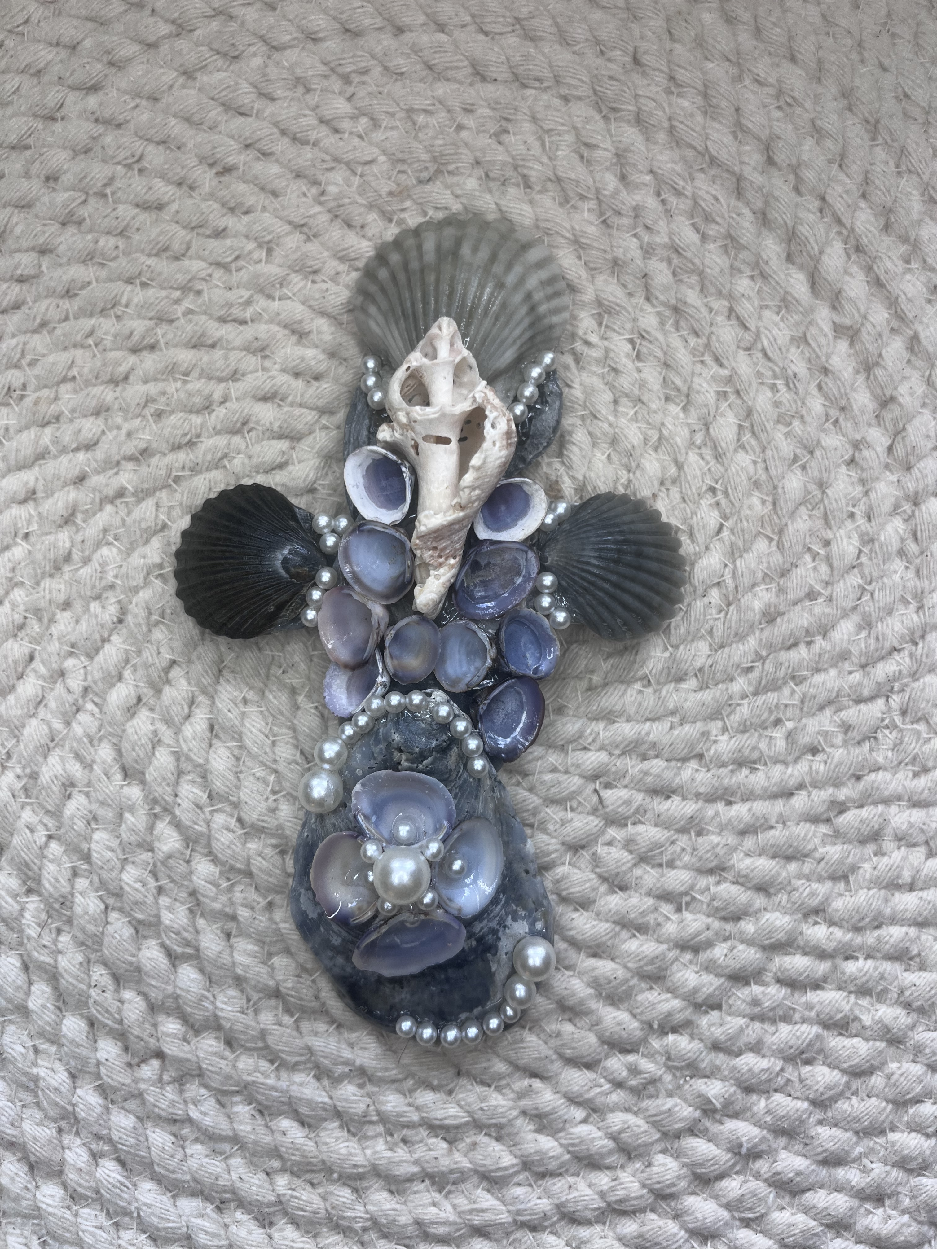 With this specific design I am using darker grey and black tones of scallop shells, along with Asiatic clam shells, which are the tiny purple colored ones on center. I find these in the river of my hometown ! Lastly in the center of the cross is a whelk shell. Throughout the cross I decorate with faux pearls to give an enchanting appearance.