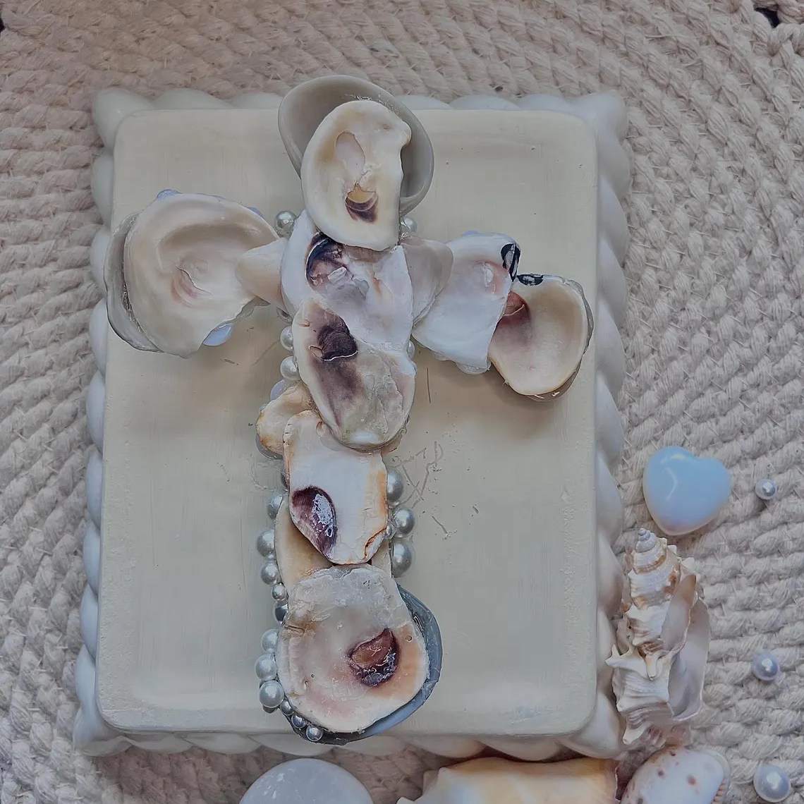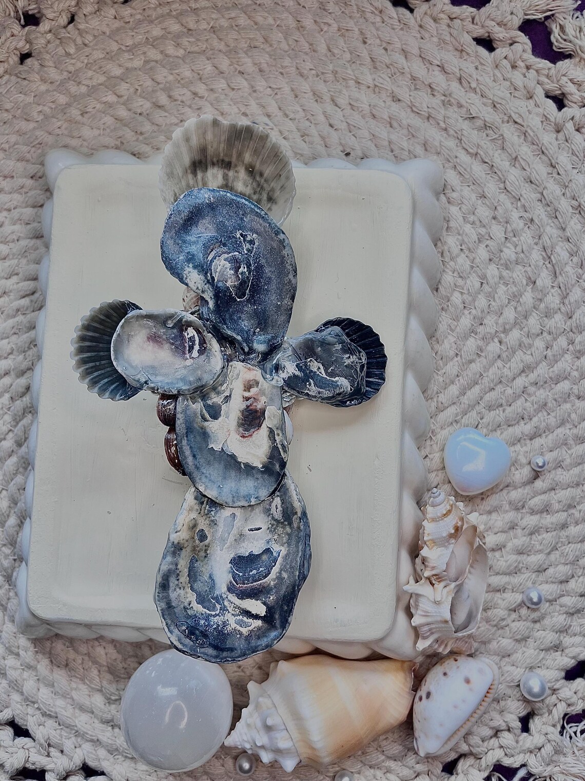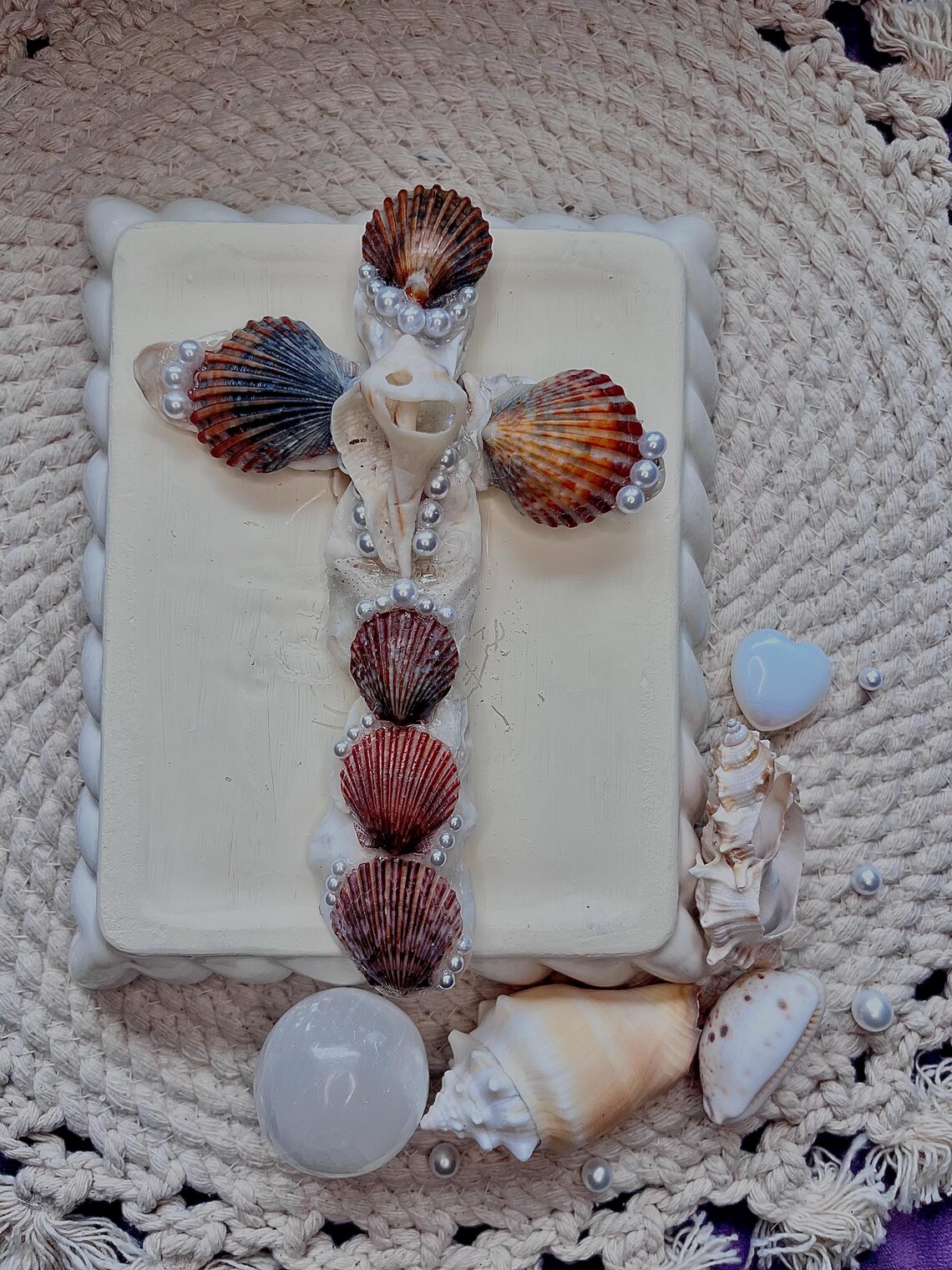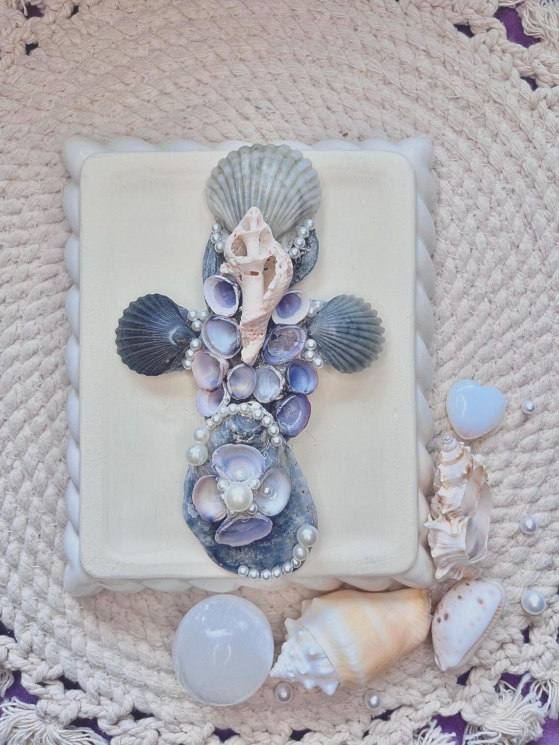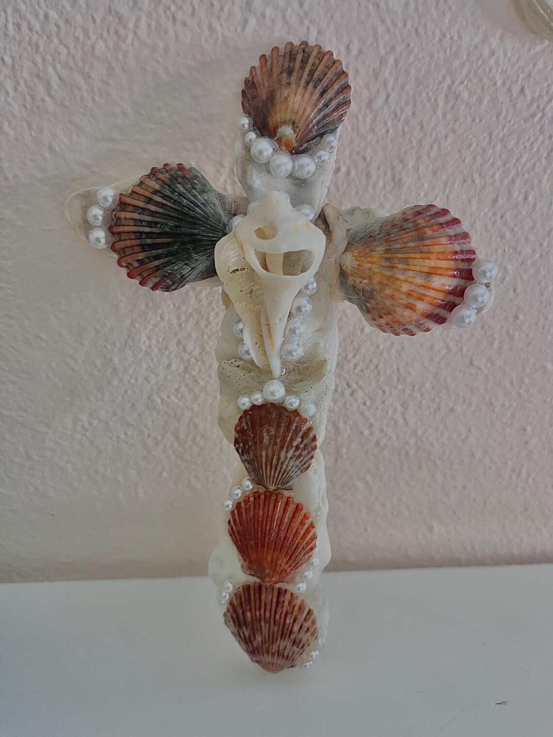 With this specific design I am using darker grey and black tones of scallop shells, along with Asiatic clam shells, which are the tiny purple colored ones on center. I find these in the river of my hometown ! Lastly in the center of the cross is a whelk shell. Throughout the cross I decorate with faux pearls to give an enchanting appearance.