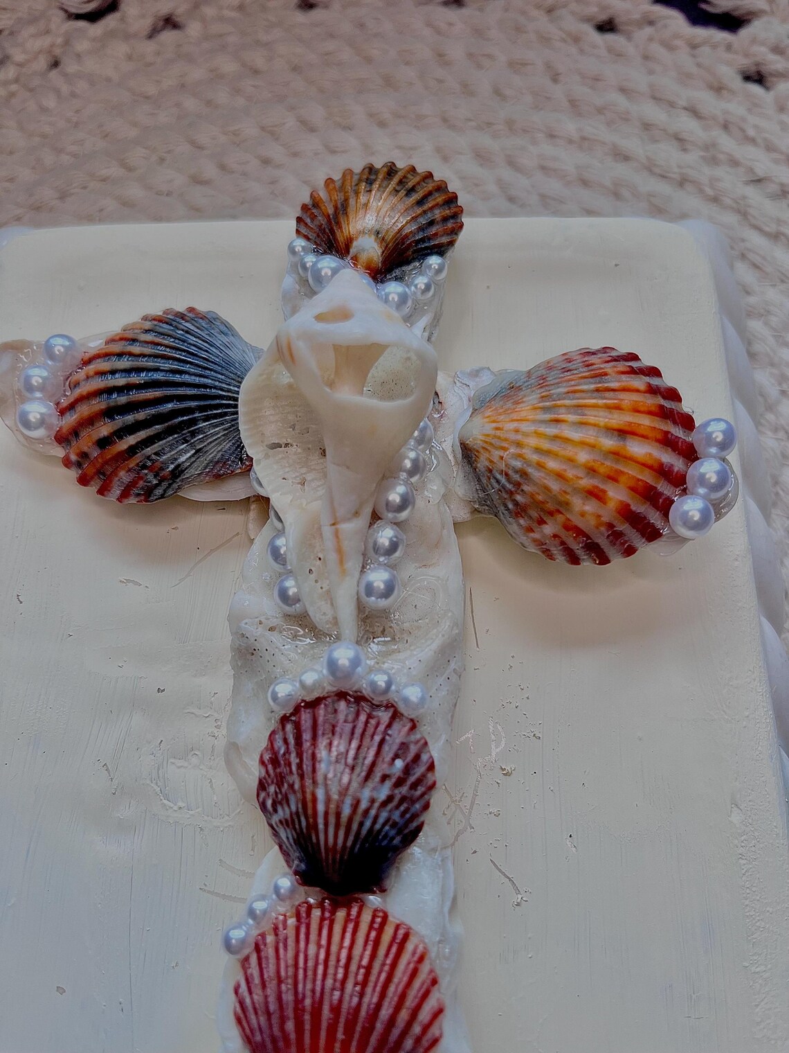 With this specific design I am using Calico Scallop Shells with the color variations of red, orange, and black. In the center of the cross is a whelk shell, I like to put these in the center of the cross as it just satisfies me as the final touch. Throughout the cross I decorate with faux pearls to give an enchanting appearance.