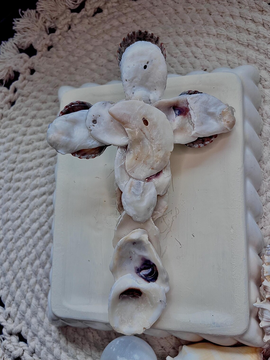 Handpicked shells right from the bay, down in Texas! This cross is a one of a kind design that follows my style in creation. The shells all have imperfections that reflect the beauty of nature. This cross can lay flat or be propped up onto a surface.
