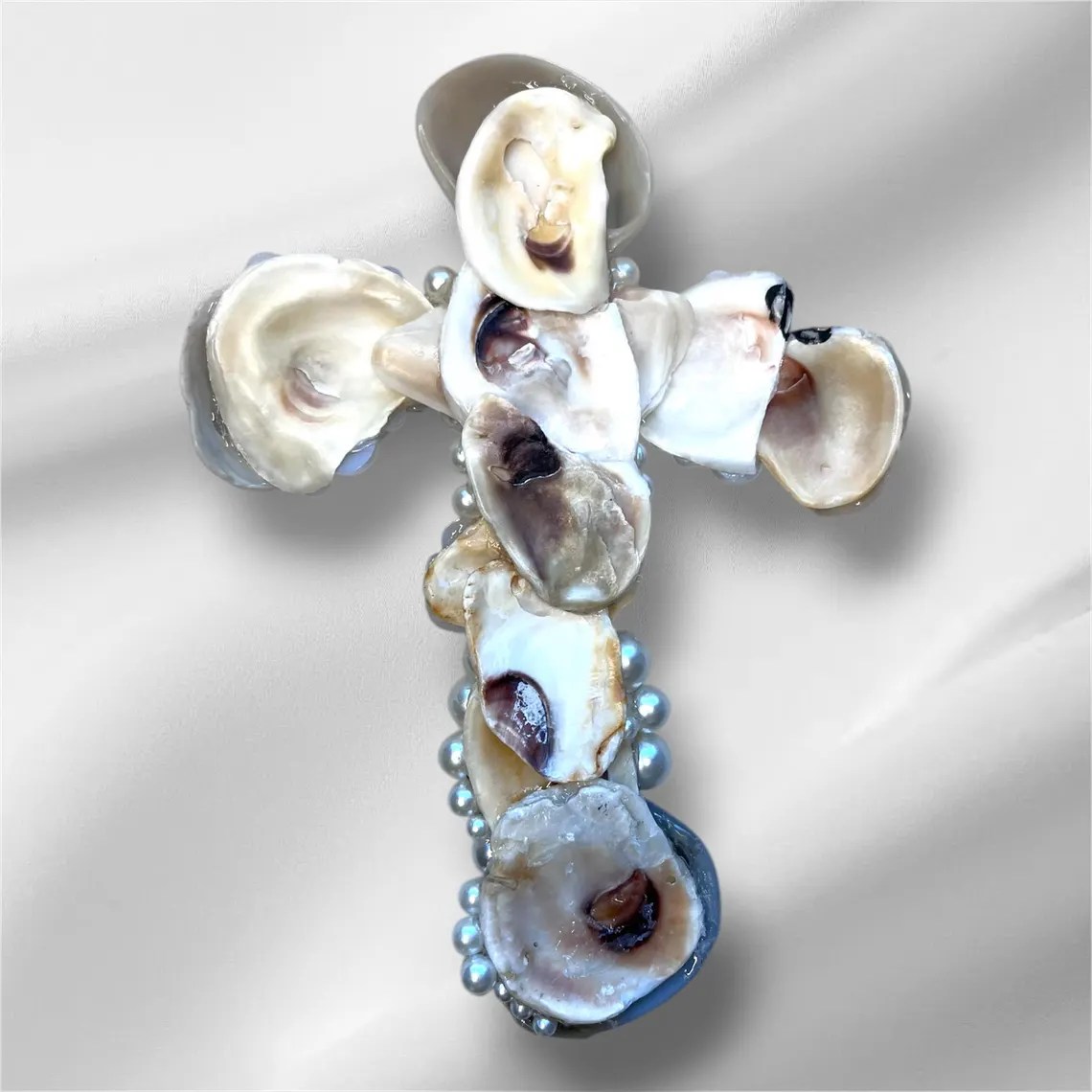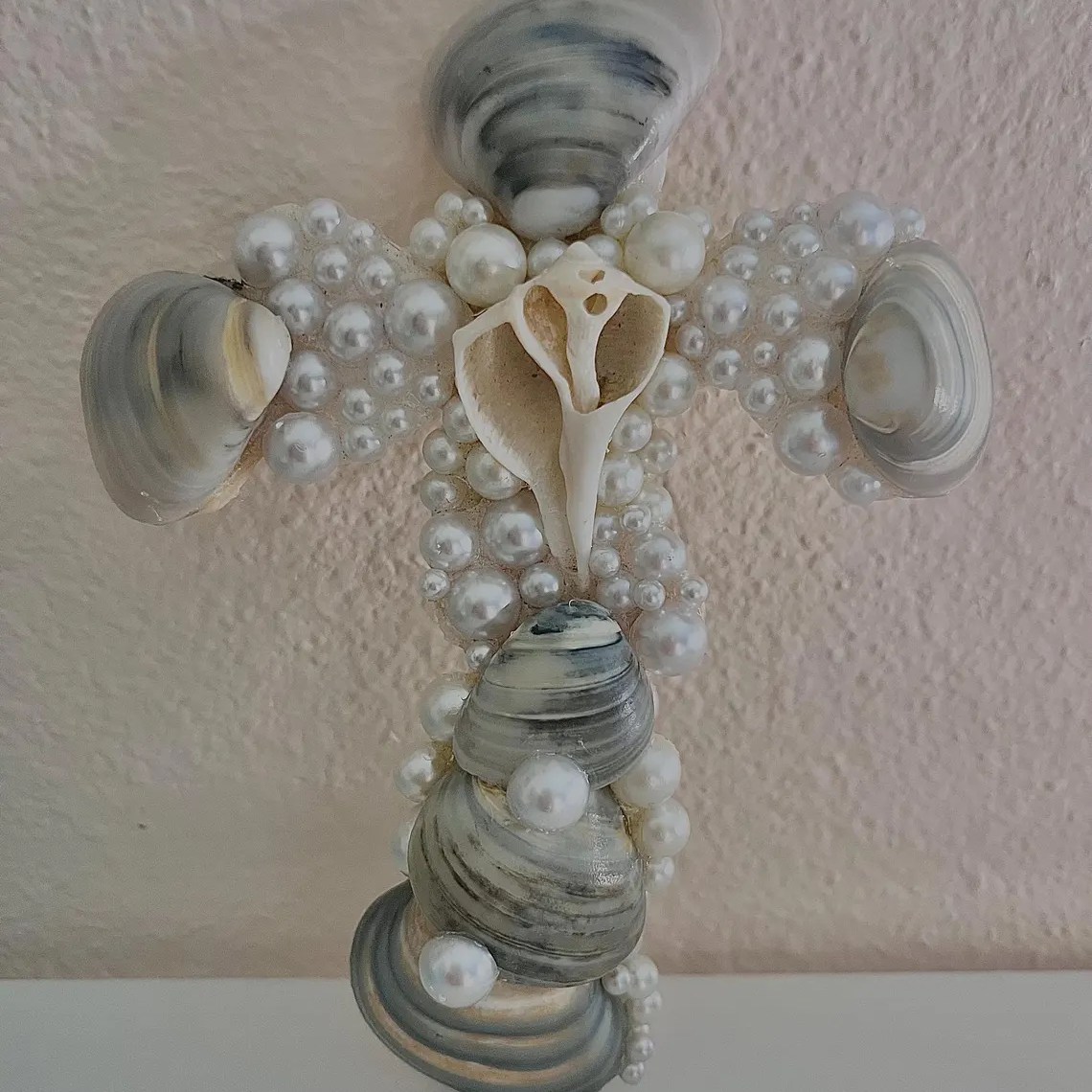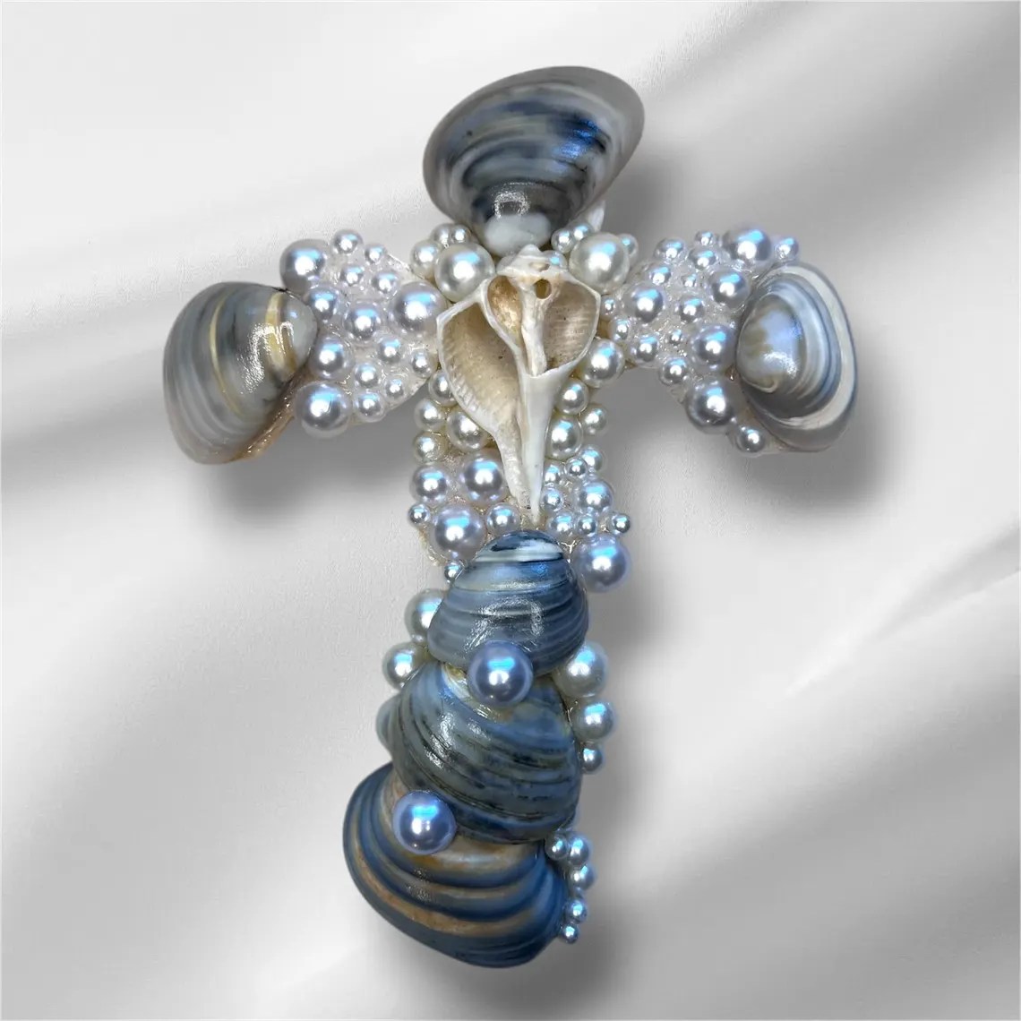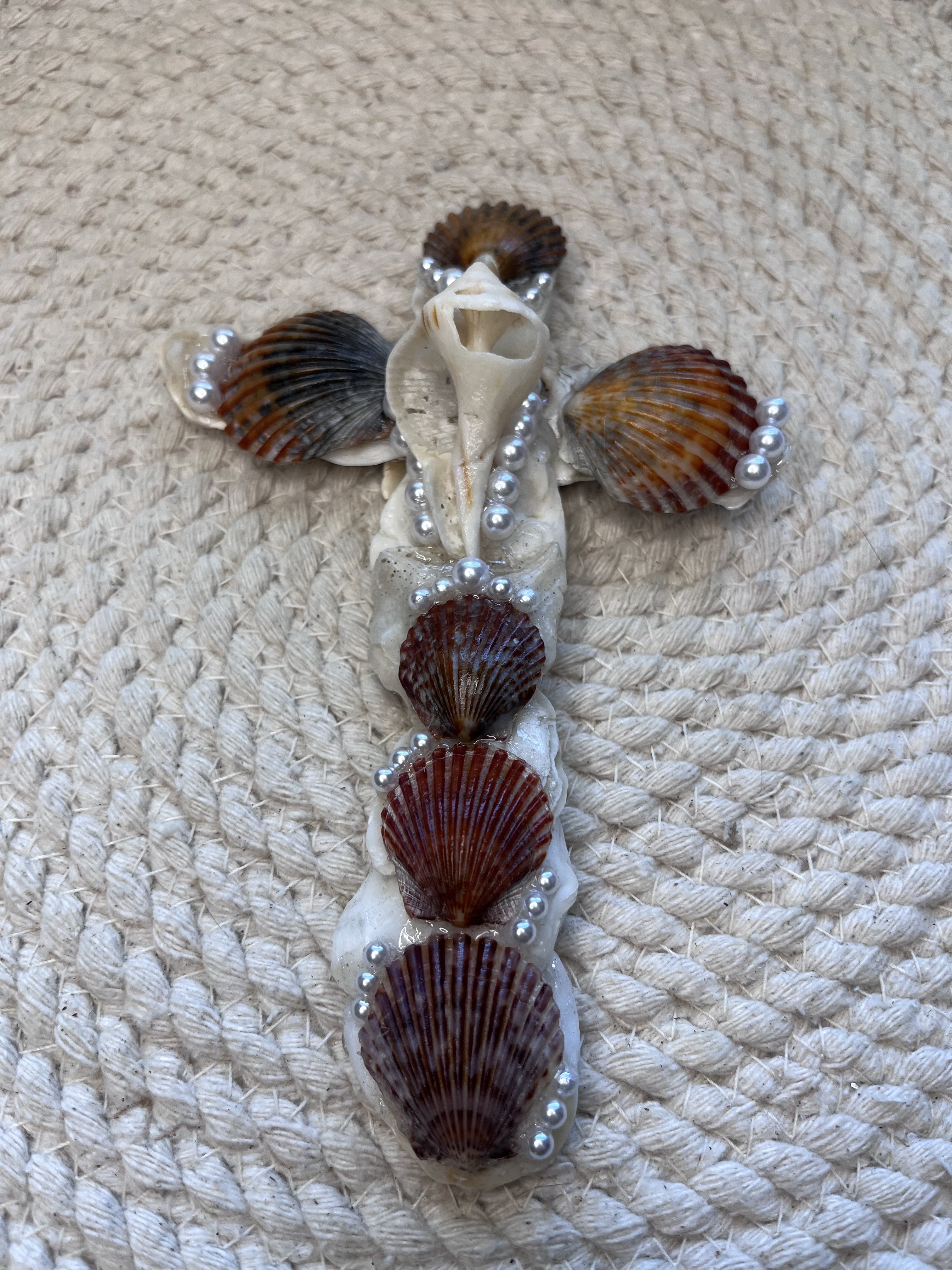 With this specific design I am using Texas Quahog Shells with the color variations of gray, white, and black. In the center of the cross is a whelk shell, I like to put these in the center of the cross as it just satisfies me as the final touch. Throughout the cross I decorate with faux pearls to give an enchanting appearance.